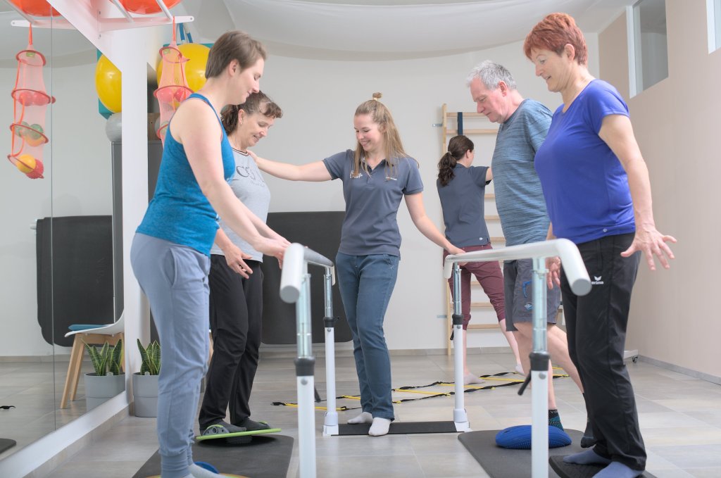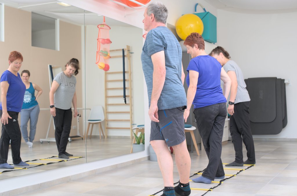 Um Stürze zu vermeiden, ist es wichtig, den Gleichgewichtssinn mit verschiedenen Übungen und Gehen auf verschiedenen Untergründen regelmäßig zu trainieren. Zudem kann dadurch auch die Reaktionsgeschwindigkeit erhöht werden. Die Verbesserung der Stabilität und Gangsicherheit erleichtert die Bewältigung des Alltags und schützt vor Verletzungen. Diese Gruppenbehandlung macht Claudia Kaiser.